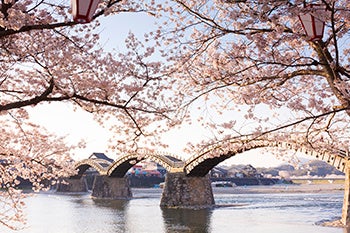 5連のアーチを描く錦帯橋と約1,500本の桜が紡ぐ風光明媚な景観。多品種の桜が、歴史ある木造の橋を彩り、春を告げる。河川敷や芝生エリアで橋と桜を愛でながら、お弁当を食べるのもおすすめ。夜はライトアップされて艶やかな姿を楽しむことができる。