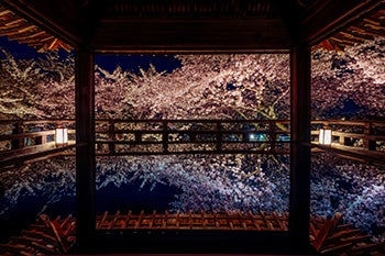 国宝や重要文化財の建物が立つ境内を約1,300本の桜が彩る。観月舞台にアクリル板を敷き、桜のリフレクションを撮影できる5分間の貸切を今年も開催(※予約優先、有料)。艶やかにライトアップされた桜が映りこみ、別世界に誘われたような美しさが広がる。