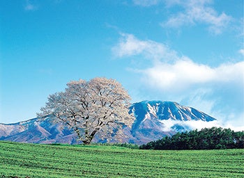岩手山麓に広がる自然豊かな農場の中にあり、岩手山を背景に牧草地に咲く一本桜。明治40年代に植えられたといわれている江戸彼岸桜で、「小岩井農場の一本桜」として親しまれている。残雪の岩手山とのコントラストも美しく、春の訪れを告げる風景。