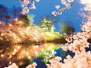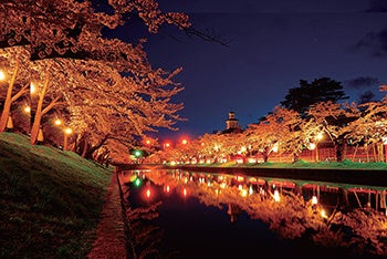 「日本三大夜城」の一つに数えられ、桜と三重櫓が照らされて、お堀の水面に浮かび上がる様は圧巻。3月29日(水)~4月12日(水)には「高田城址公園観桜会」を開催予定。この期間は日没から21:00(桜の最盛期は~22:00)までライトアップされる。