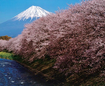 静岡県富士市の潤井川(うるいがわ)沿いの龍巌淵で堪能できる桜並木。ピンクの桜と黄色の菜の花が富士山を春色に彩るスポットで、約50本の桜はボリューム満点。一度見れば忘れられないほどインパクト抜群です。その桜と菜の花、清流、さらに残雪の富士山が一体になった風景は、日本らしさを存分に感じられる、心に残る春の絶景。※駐車場がないため、公共交通機関をご利用ください