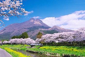 大分川沿いに整備された自然遊歩道。春になると、「ゆふいん山水館」近くの御幸橋から城橋にかけての約500mは、桜並木と菜の花が彩る華やかな春色ロードに。視線を上げると美しい由布岳の姿を見ることができる、春絶景の散歩道。