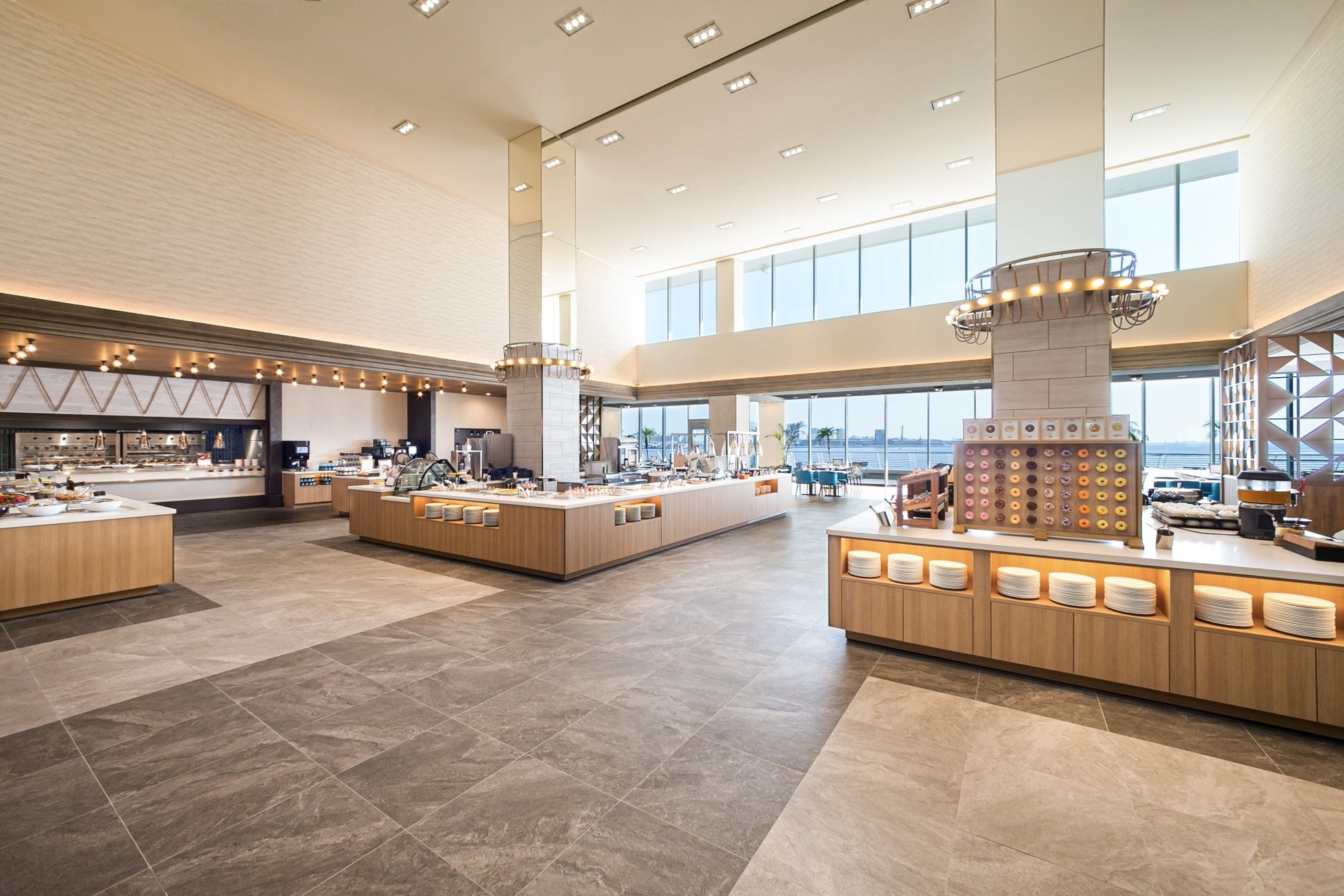 目の前に水平線が広がる、豪華客船のメインダイニングのような上質で開放感あふれるブッフェスタイルのレストラン。