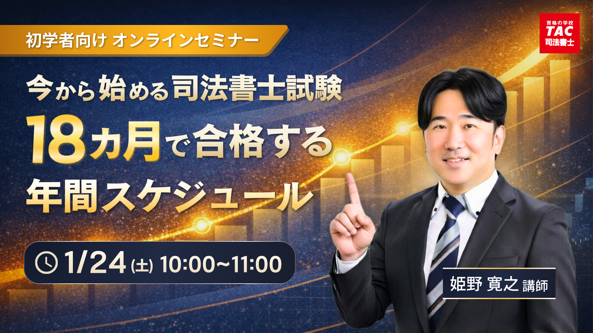 18ヶ月で合格する年間スケジュール」を1月24日(土)10:00より開催いたします。これから学習を始める方、司法書士試験の受験を検討している方に向けたオンラインセミナーです。