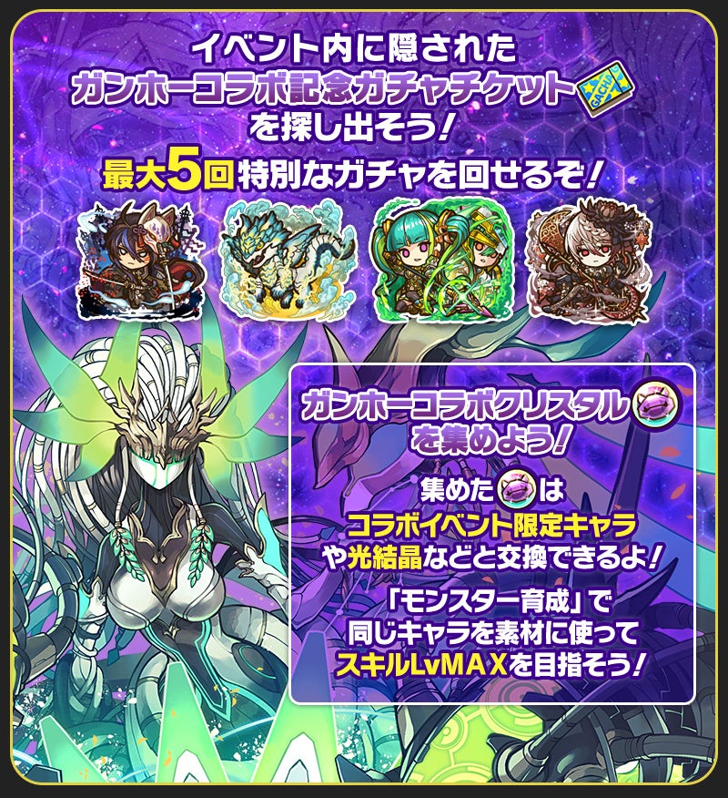 本コラボイベントでは、ガンホータイトルの『パズル&ドラゴンズ』『ケリ姫スイーツ』『ラグナロクオリジン』『ニンジャラ』などのモンスターやキャラクターたちが、コラボガチャやダンジョンに登場します。