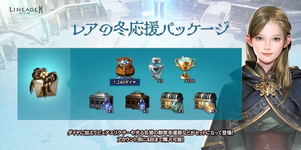 期間限定で、1,240ダイヤと「光る名誉の勲章幸運箱(刻印)」3個や「光る啓示の証幸運箱(刻印)」3個、「ピュアエリクサー(刻印)」5個などが入った「レアの冬応援パッケージ」が登場しました。