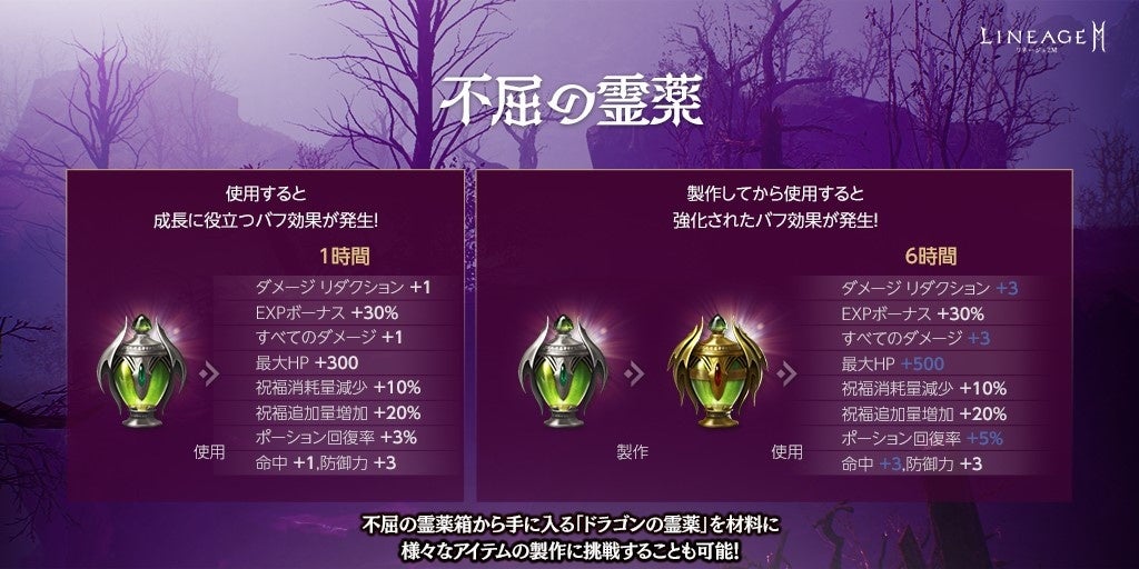 「不屈の霊薬箱」から獲得できる「ドラゴンの霊薬」は、使用することで「ダメージ リダクション」や「EXP ボーナス」を一定時間向上できるほか、製作の材料としても使用することができます。この「不屈の霊薬箱」を含む特別なパッケージも、本日同時に登場しました。