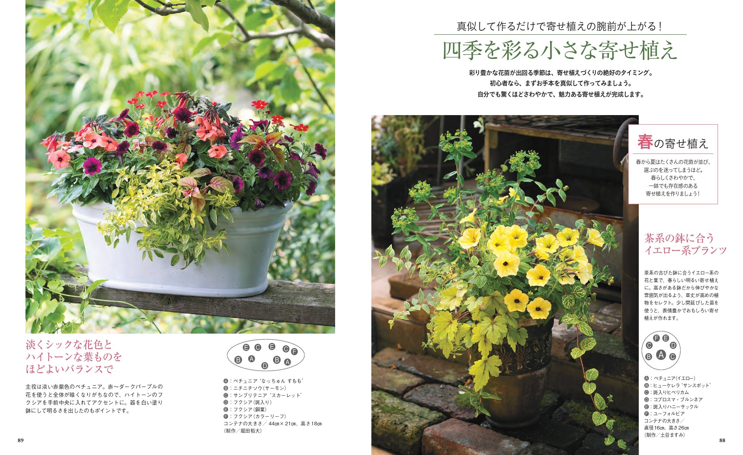ひとつの植物を大きな鉢にボリュームを出して植え込んで置くのもすてきですが、季節の花々を組み合わせた寄せ植えにすれば、とたんに格上げされた空間に。春夏秋冬の寄せ植えの作り方も丁寧に説明しています。