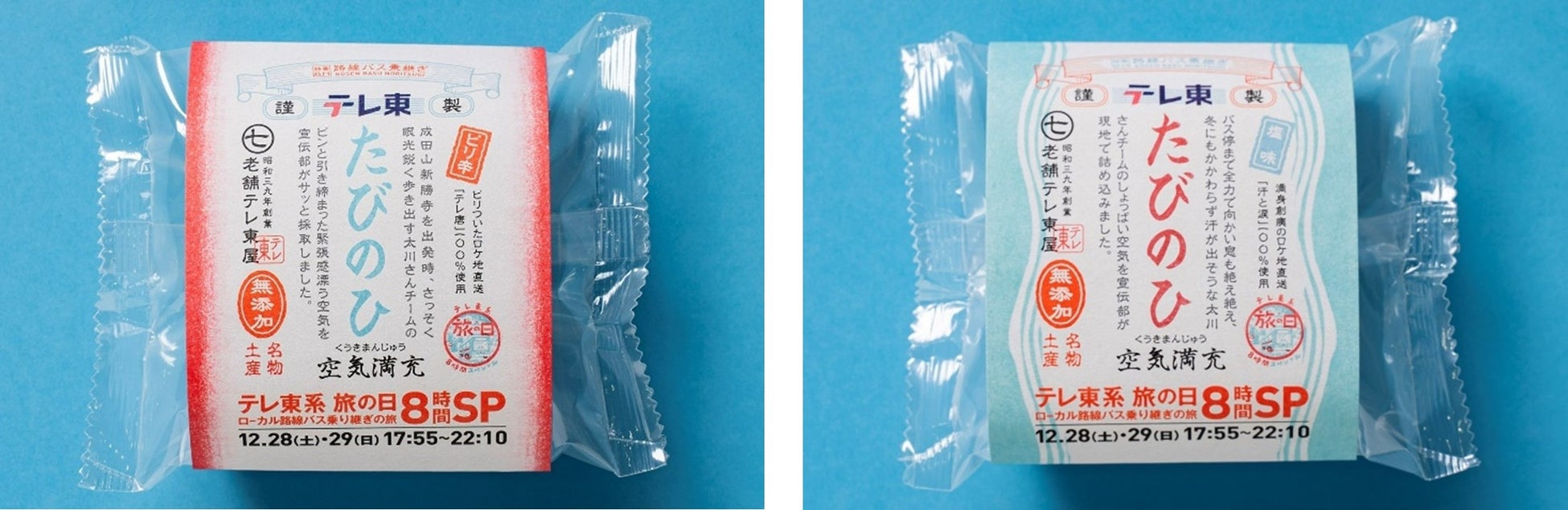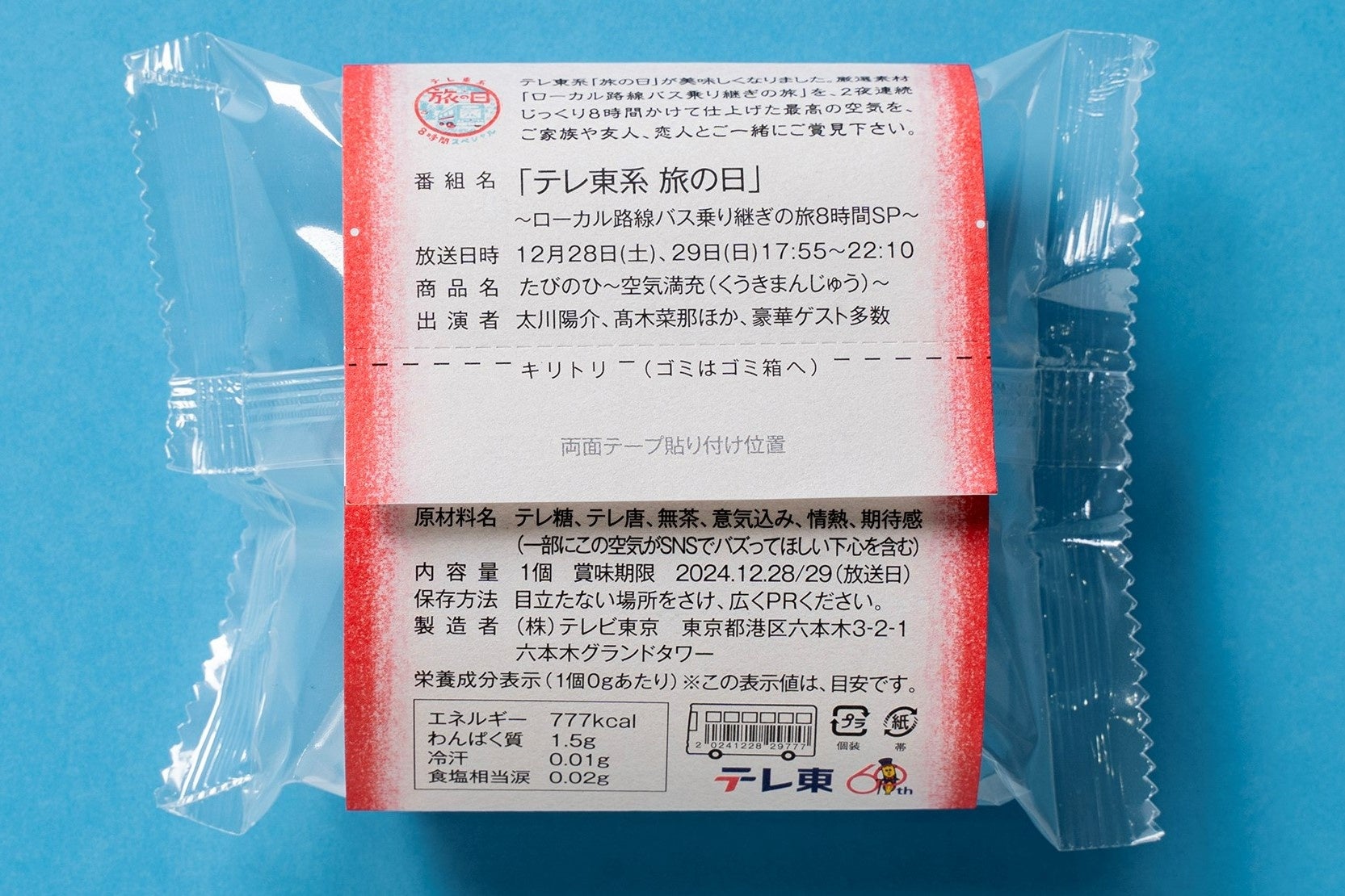 さらに、前回は大好評につき、掲出からわずか2時間足らずですべてなくなってしまった“ロケ現場の空気のお土産”ピールオフイベントの第2弾を、本日12月23日(月)から12月29日(日)までの1週間、JR池袋駅構内の「パノラマ池袋B」(JR南改札そば・東武百貨店前「オレンジロード」角)にて実施します!巨大な番組ポスターを覆い隠すように貼り付けられるのは、「テレ東系 旅の日」の撮影現場でスタッフが実際に採取した空気を和菓子風にパッケージ化した“空気のお土産”、その名も空気満充(くうきまんじゅう)「たびのひ」。実際の老舗和菓子店にパッケージ加工を依頼し、パッケージに書いてある空気のキャッチコピーや裏面の商品表示にも仕掛けを施すなど、こだわりの詰まった品に仕上がりました。数量も前回より遥かに多くの人に届けられるよう、約7倍にしてパワーアップ!通行人の方々にはポスターから剝がして無料でお持ち帰りいただけます!