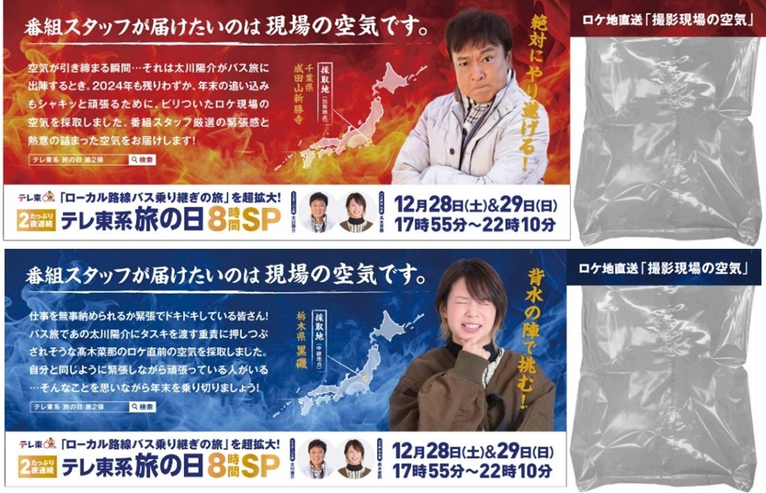 “テレ東系 旅の日”第2弾、実際の“ロケ現場の空気”がJR線の中づり広告をジャック!さらに前回大好評を博した“ロケ現場の空気のお土産”ピールオフイベント第2弾が12/23からJR池袋駅で実施!