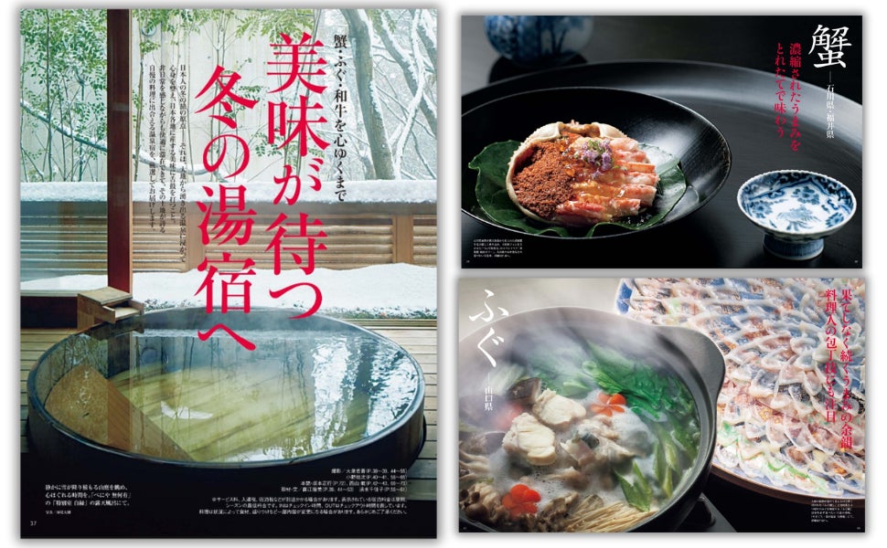 冬の日本海を望む絶景、山庭に抱かれながら浸かる露天風呂、食と文化を発信するニューオープンのオーベルジュ。多彩なスタイルで供される蟹尽くしの料理を堪能する、石川・福井の湯宿を3軒ご案内します。また、各宿がおすすめする酒蔵と話題の新店にも注目です。