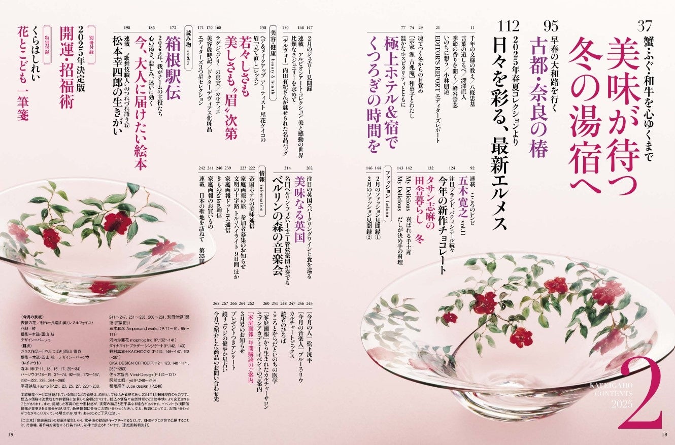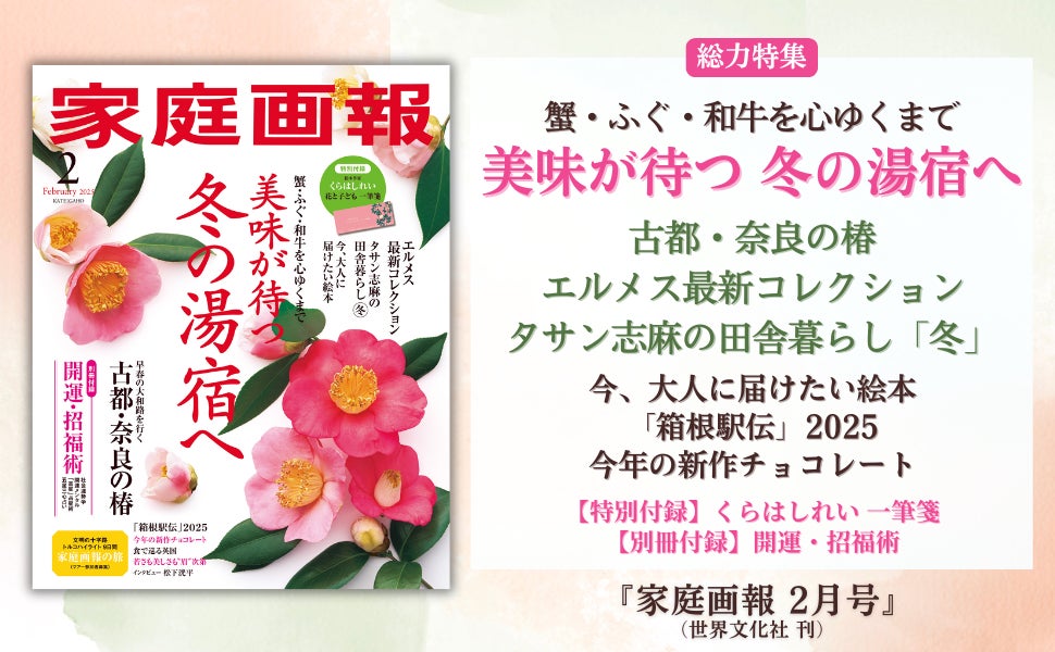 株式会社世界文化社は、『家庭画報 2月号』を12月27日(金)(関⻄・東海地区は12⽉26⽇)に発売しました。巻頭特集「美味が待つ 冬の湯宿へ」では、冬ならではの美味、蟹・ふぐ・和牛を堪能する湯宿をご紹介。「古都・奈良の椿」では、椿文化を守る大和路の人々と古刹を巡ります。また、ファッション企画「エルメス最新コレクション」や、大人気季節連載「タサン志麻の田舎暮らし 冬」、新年の風物詩を徹底取材「箱根駅伝 2025」、今届けたい「絵本」や「チョコレート」の魅力。さらに、特別付録に「2025年 開運・招福術」&「くらはしれい一筆箋」。来たる2025年の幕開けにふさわしい、豪華な企画満載でお届けします。