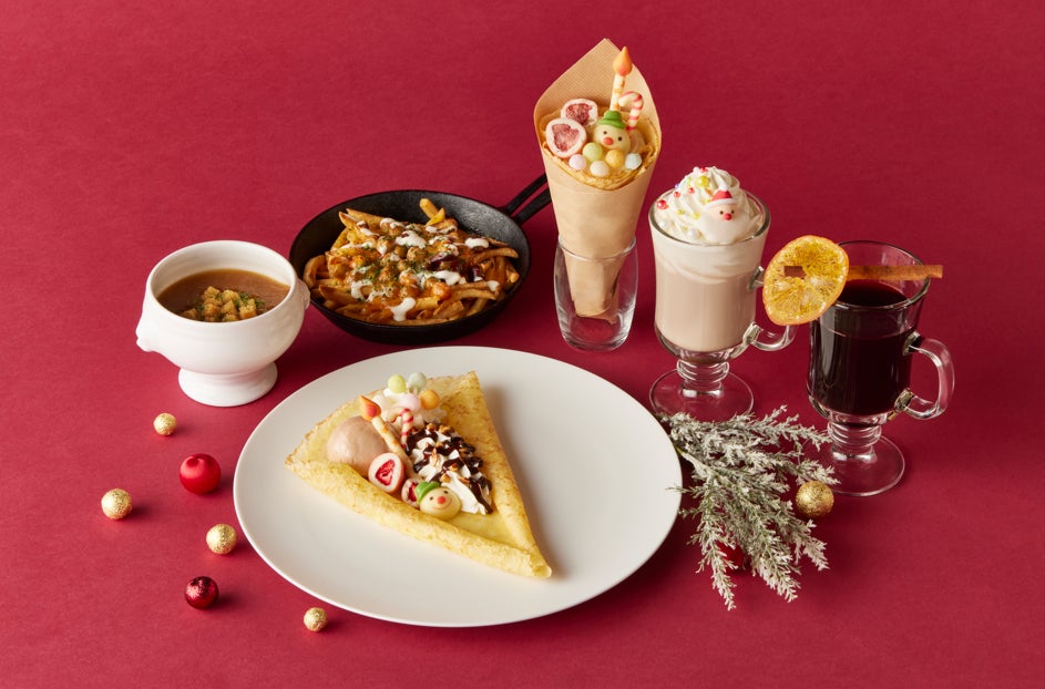 メニュー: オニオンスープ、ホットワイン、ホットチョコレート、チリチーズフライ、クレープなど