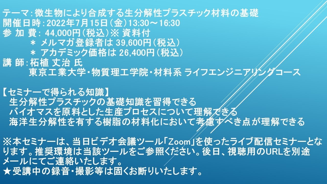 先端技術情報や市場情報を提供している(株)シーエムシー・リサーチ(千代田区神田錦町: https://cmcre.com/ )では、 各種材料・化学品などの市場動向・技術動向のセミナーや書籍発行を行っておりますが、 このたび「微生物により合成する生分解性プラスチック材料の基礎」と題するセミナーを、 講師に柘植 丈治 氏 東京工業大学・物質理工学院・材料系 ライフエンジニアリングコース)をお迎えし、2022年7月15日(金)13:30より、 ZOOMを利用したライブ配信で開催いたします。 受講料は、 一般:44,000円(税込)、 弊社メルマガ会員:39,600円(税込)、 アカデミック価格は26,400円(税込)となっております(資料付)。