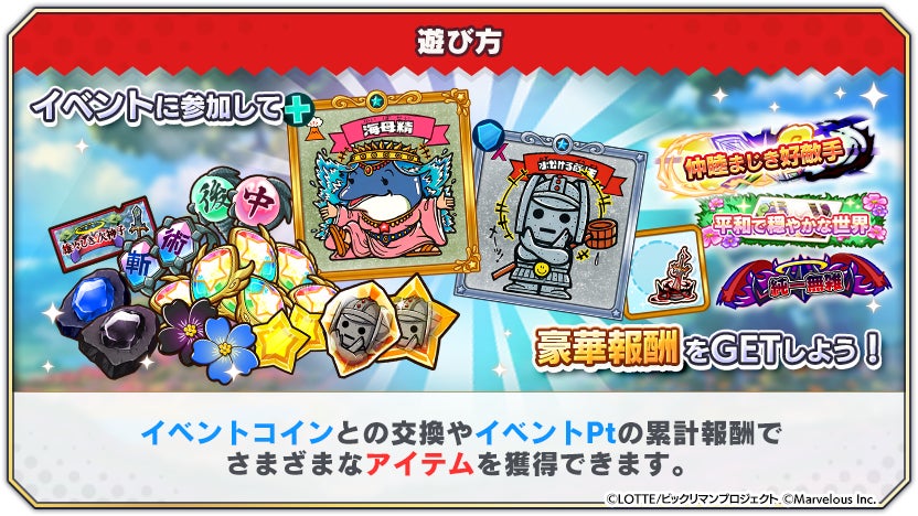 専用の称号やシールなど、さまざまなアイテムが手に入るイベントですので、キャラクターを育てて参加してみましょう!