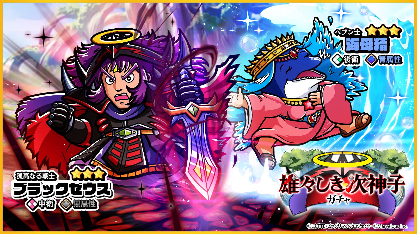 新たな☆3キャラクター[孤高なる戦士]ブラックゼウス、[ヘブン士]海母精、☆2キャラクター[光明天女]フラッシュ光后が登場する「雄々しき次神子ガチャ」を開始いたしました。