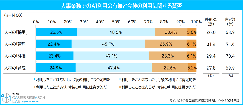 中途採用担当者が人事業務でAIを利用した割合は、「人材の管理(31.9%)」が最多で「人材の評価(29.4%)」が続いた。4社に1社以上が人事業務でAIを利用しており、今後の利用についても全項目で7割程度が肯定的としている。AIにより感情の伴わない客観的な判断や業務の効率化を実現することはできるが、AIも人も完璧ではないことを認識し、バランス良く業務に取り入れることが重要だと考える。【図4】