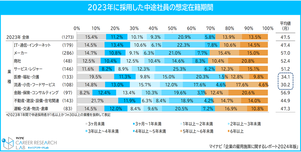 中途採用担当者が想定する、直近1年間に採用した中途社員の在籍期間は平均4年。流通・小売・フードサービスでは3年未満【図5、6】
