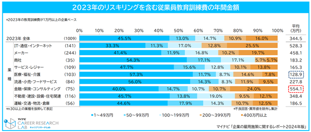 2023年に企業が従業員に使った教育訓練費(リスキリング費用含む)は年間平均344.5万円。金額別では「1~49万円」が45.5%と最も多かった。業種別では、金融・保険・コンサルティングが554.1万円で最多。一方、医療・福祉・介護は128.9万円で最も低かった。2024年度の増減予定を聞くと、73.2%の企業が上げると回答し、2023年の教育訓練費の金額が高いほど、10%以上の高水準で教育訓練費を増加させる予定となった。【図1、2】
