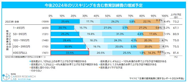 リスキリングなどの従業員教育費の平均は344.5万円。7割以上の企業が2024年度の従業員教育費を上げる予定【図1、2】