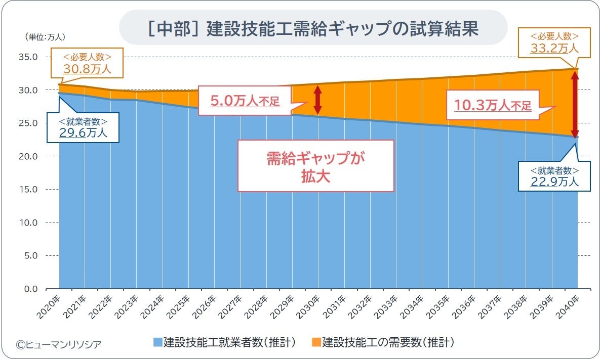 総合人材サービス会社で、建設業向けの人材派遣・海外エンジニア派遣・人材紹介事業を展開するヒューマンリソシア株式会社(本社:東京都新宿区、代表取締役:高橋 哲雄、以下「当社」)はこのたび、中部エリア(※1)における建設技術者および建設技能工(※2)の2040年までの将来の人材需給ギャップを試算しました。なお本調査は、2024年に当社が発表した全国版の建設技術者・技能工の将来推計(※3)を元に、中部エリアの人材需給ギャップについて試算したものです。