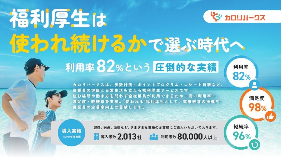 「カロリパークス」はスマートフォンアプリを活用した福利厚生サービスです。従業員の健康増進と日常生活をサポートし、健康経営の推進と満足度・定着率向上に貢献。歩くだけでポイント還元&キャッシュバック。初期費用0円で導入可能です。(AI食事記録・管理機能、AIサジェスト機能、AI健診データ管理、消費カロリー計算も)
