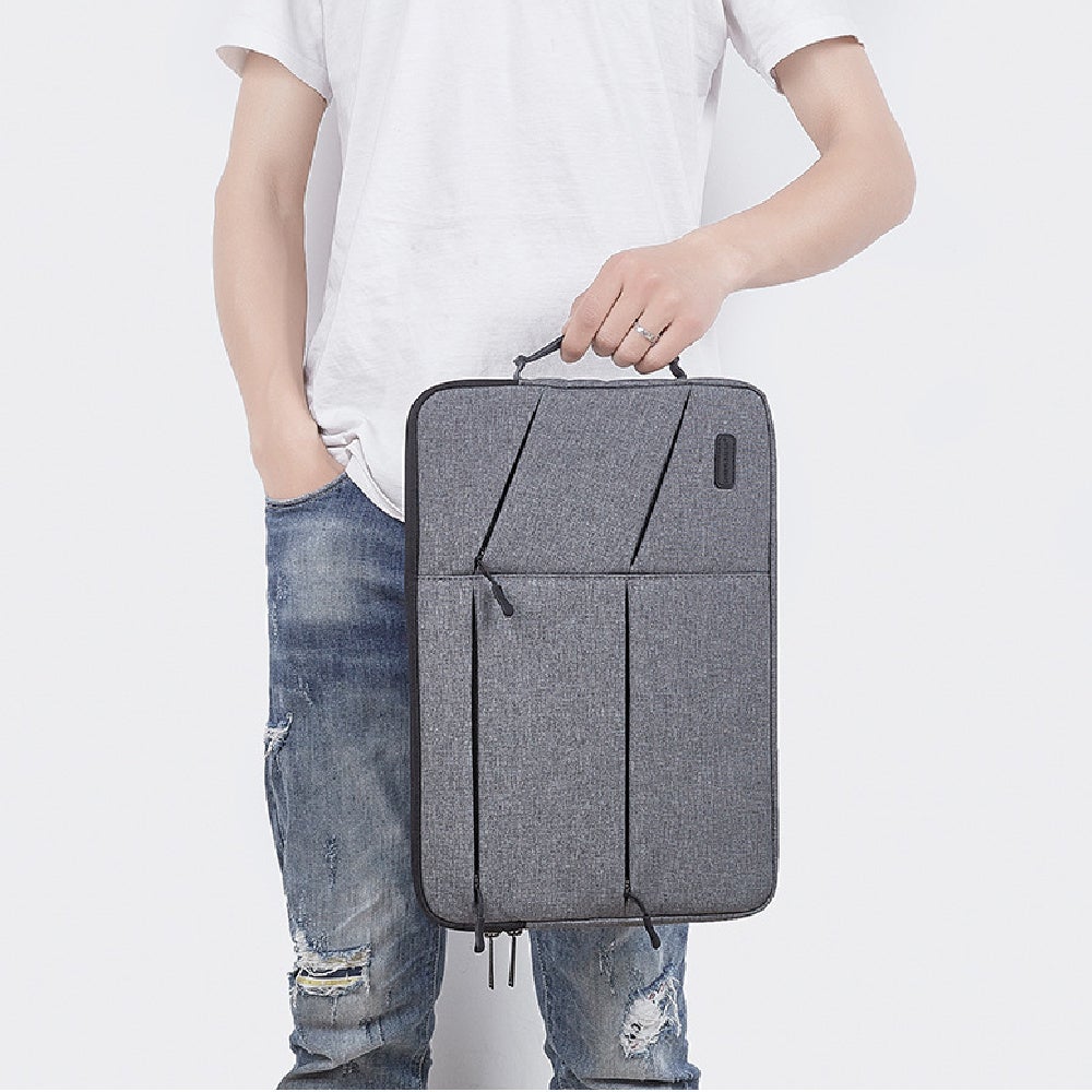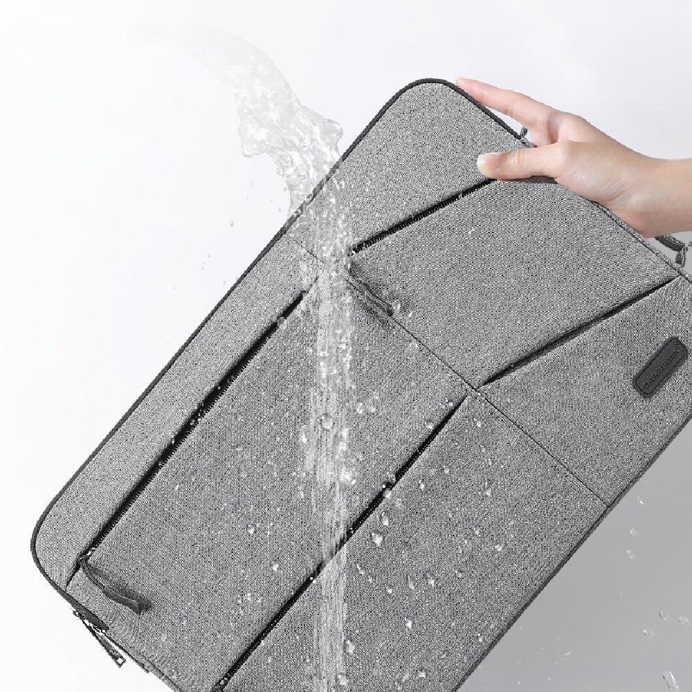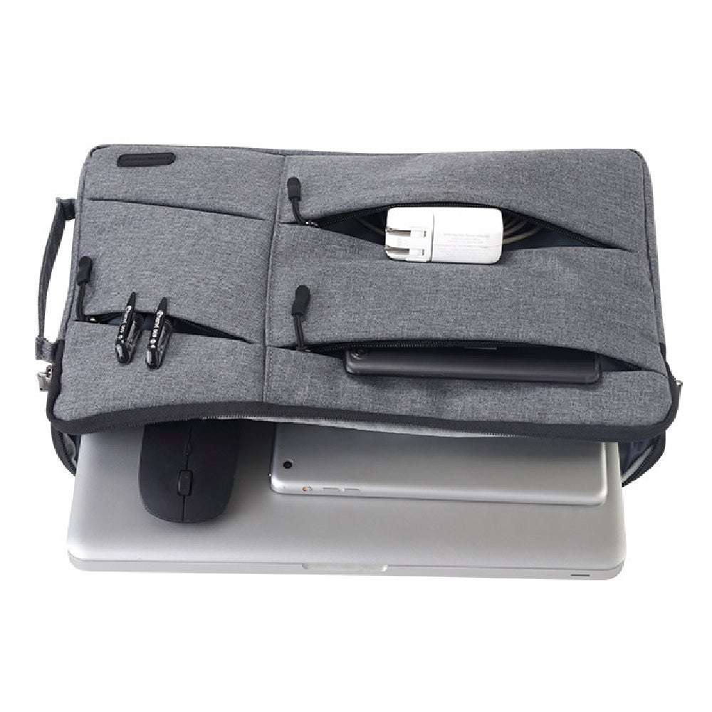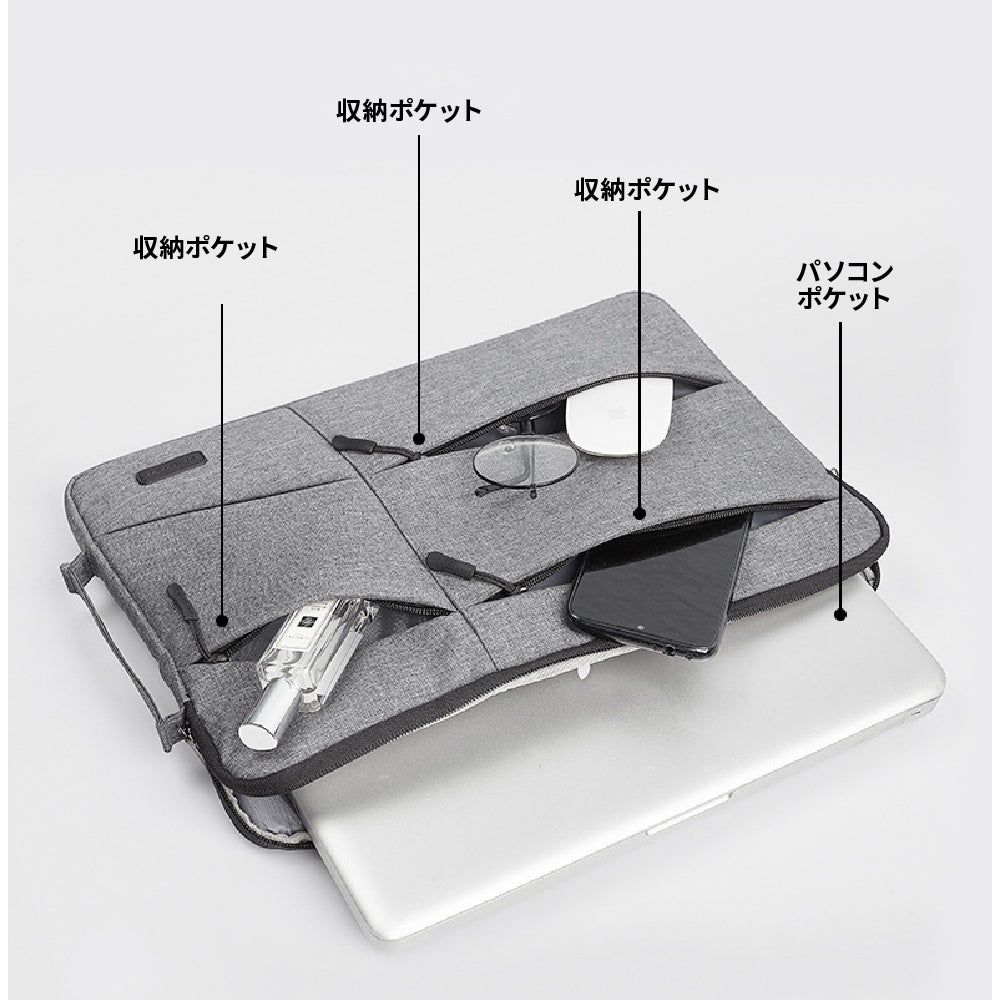 最大14インチのノートパソコンに対応し、電源ケーブルやマウスといった様々なPC用品を一つのバッグに収納することができ、柔らかい裏地と撥水性のある素材でデバイスを保護します。