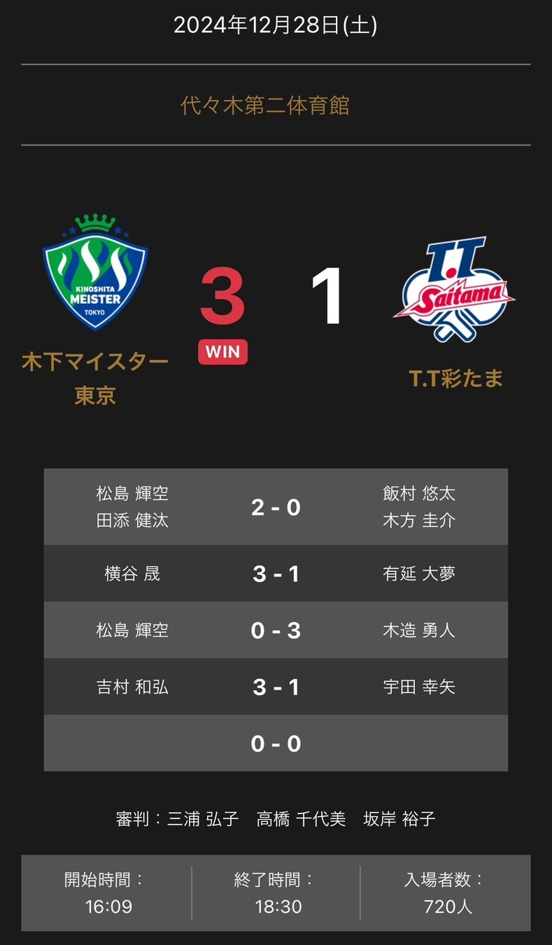 ノジマTリーグ 2024-2025シーズン 公式戦 12月28日開催 木下マイスター東京vsT.T彩たま試合結果