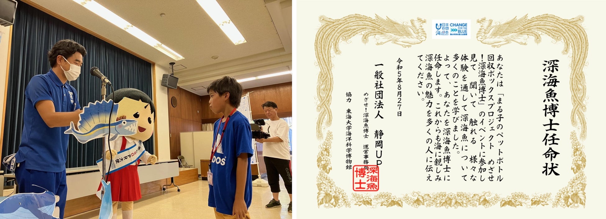 イベントの最後には、深海魚や海についての理解を深め、学んだ証として「深海魚博士」の任命状を子どもたち全員に授与しました。しずおか海ごみゼロ 大使のちびまる子ちゃんより任命状が授与され、笑顔でイベントを無事に終えることができました。これからも、今回の学びを忘れずに、深海魚の魅力や海の環境について多くの人に伝えていってほしいと伝え、締めくくりとなりました。
