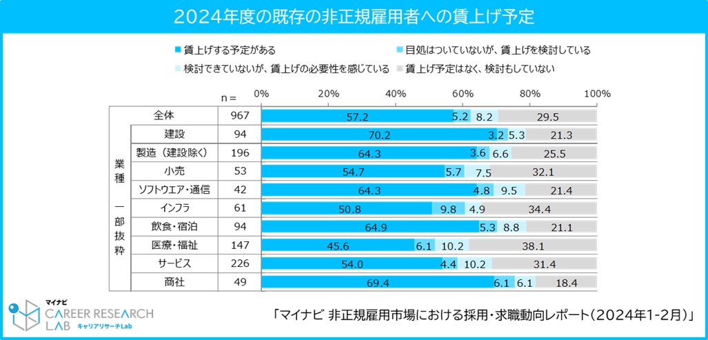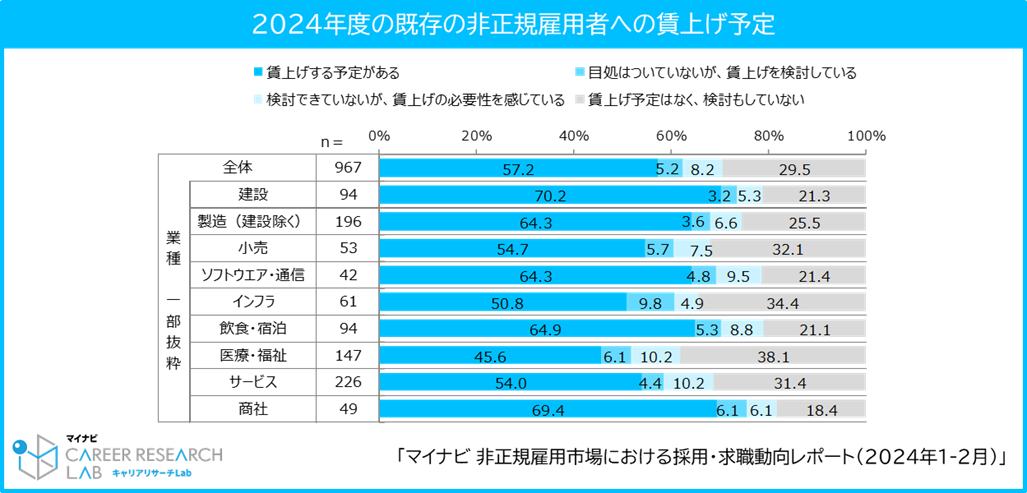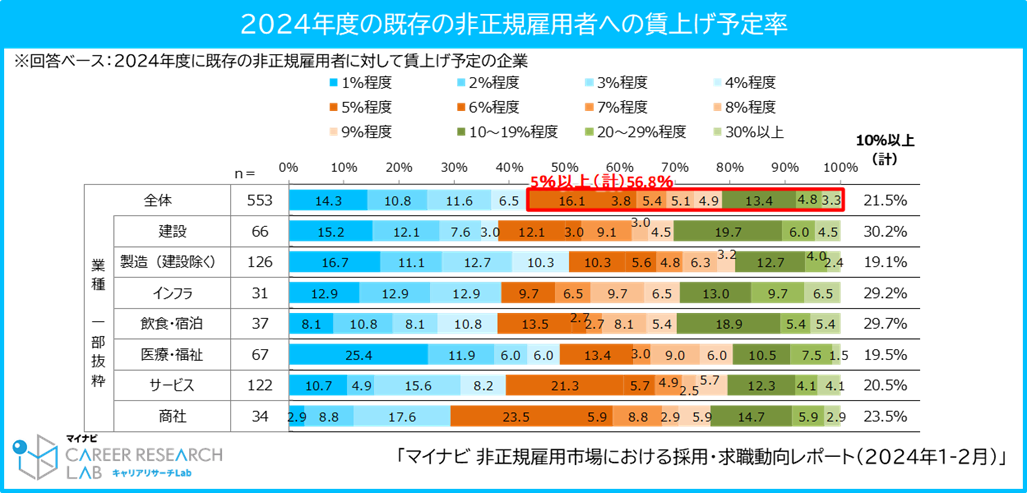 物価高や最低賃金改定などの影響も受け、2024年度に非正規雇用者に対する賃上げ予定の企業が多い様子がうかがえました。2024年の賃上げ率は30年ぶりの高水準であった2023年を超えることが見込まれ、建設や飲食・宿泊業で賃上げ率が高くなると考えられます。