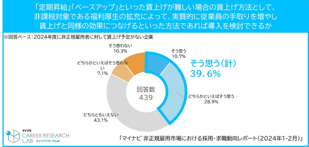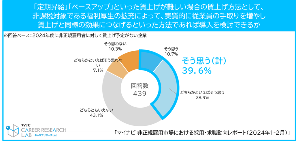 2024年度に非正規雇用者への賃上げ予定がない企業に、非課税対象である福利厚生の導入・改定によって、実質的に従業員の手取りを増やし賃上げと同様の効果につなげる方法であれば導入を検討できるか聞いたところ、そう思う割合は39.6%となった。