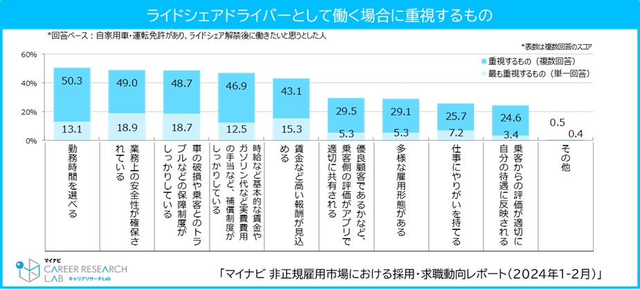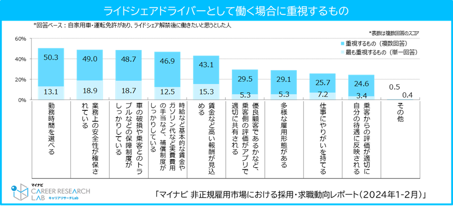 また、今回の調査では2024年4月より解禁されるライドシェアに関する求職者の意見もうかがいましたが、認知度は約3割・就業意向は2割程度にとどまっています。一方で、働きたいと思う人が重視することとして「勤務時間が選べる」が最多になったことから、今後認知が広まるにつれて新たな働く選択肢の1つとなっていくことも考えられるでしょう。