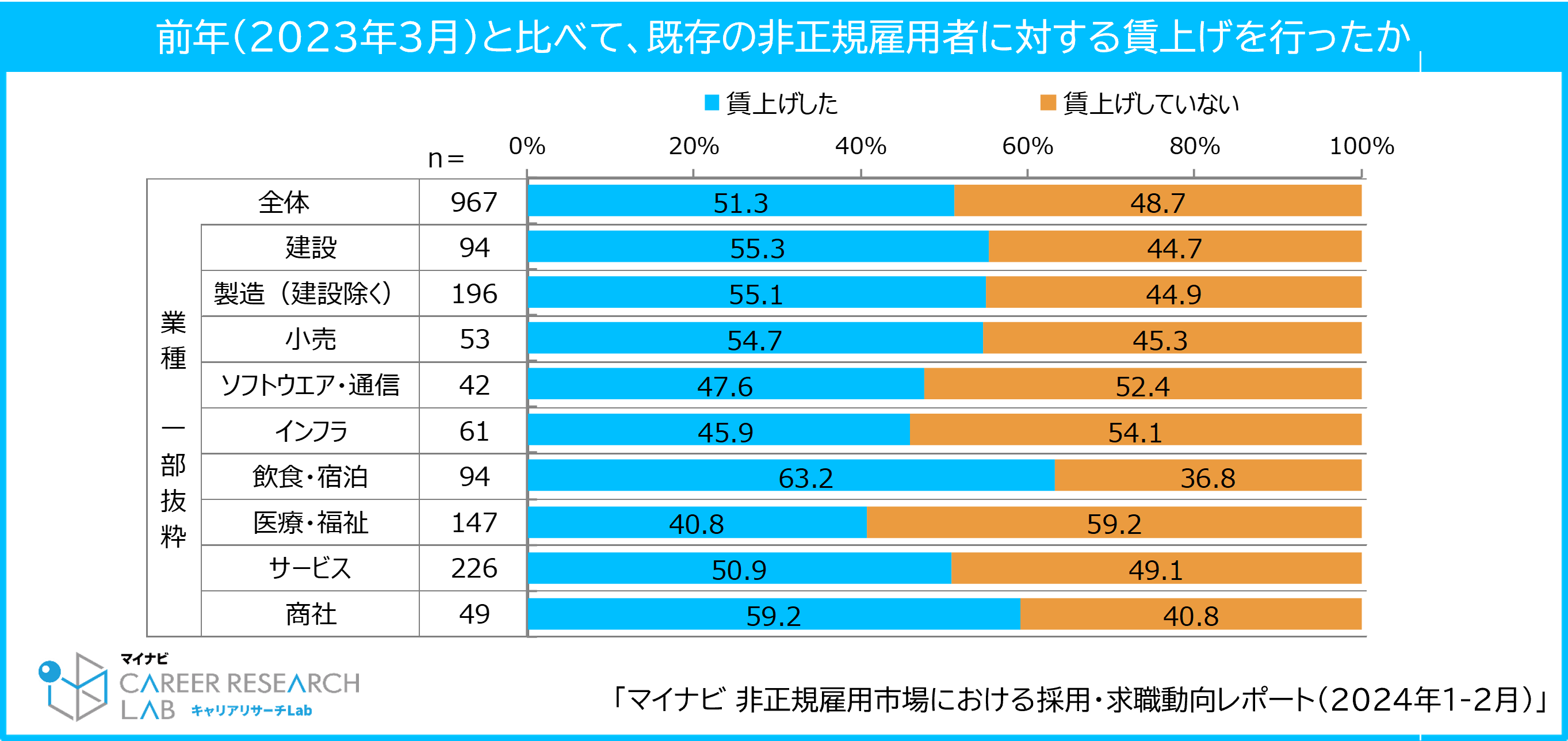 前年(2023年3月)と比べて、既存の非正規雇用者に対する賃上げを行った企業は51.3%で、業種別では[飲食・宿泊]で63.2%と最も高かった。また、2024年度に賃上げを予定している企業は57.2%で、業種別では[建設]で70.2%と最も高くなった。【図2、3】