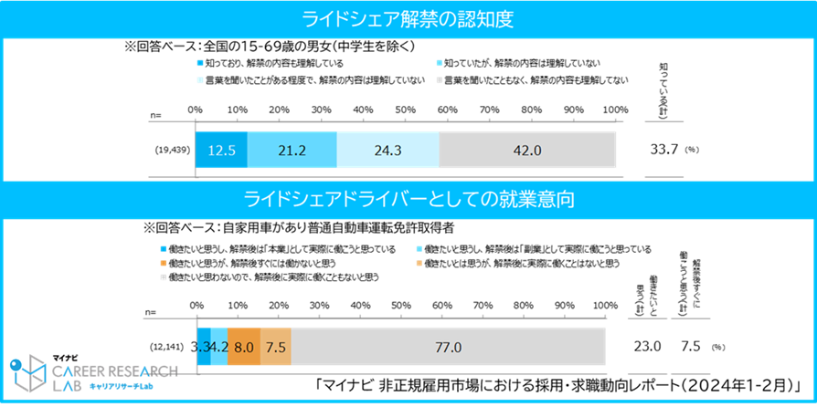 2024年4月解禁のライドシェアの認知度は33.7%と、就業意向がある割合は23.0%に留まる【図7、8】