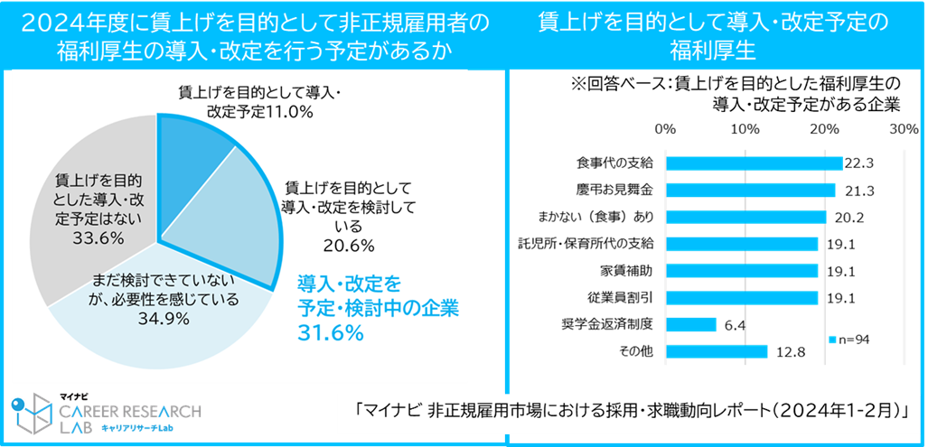 「定期昇給」「ベースアップ」といった、通常の賃上げとは異なる賃上げ方法となる福利厚生の導入・改定に関心がある企業が多いことから、実際の賃上げと合わせて非正規社員に対する福利厚生の見直しや拡充に今後期待が持てそうです。