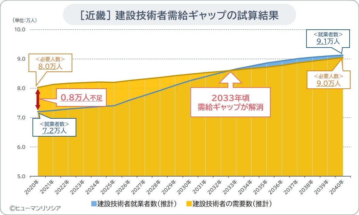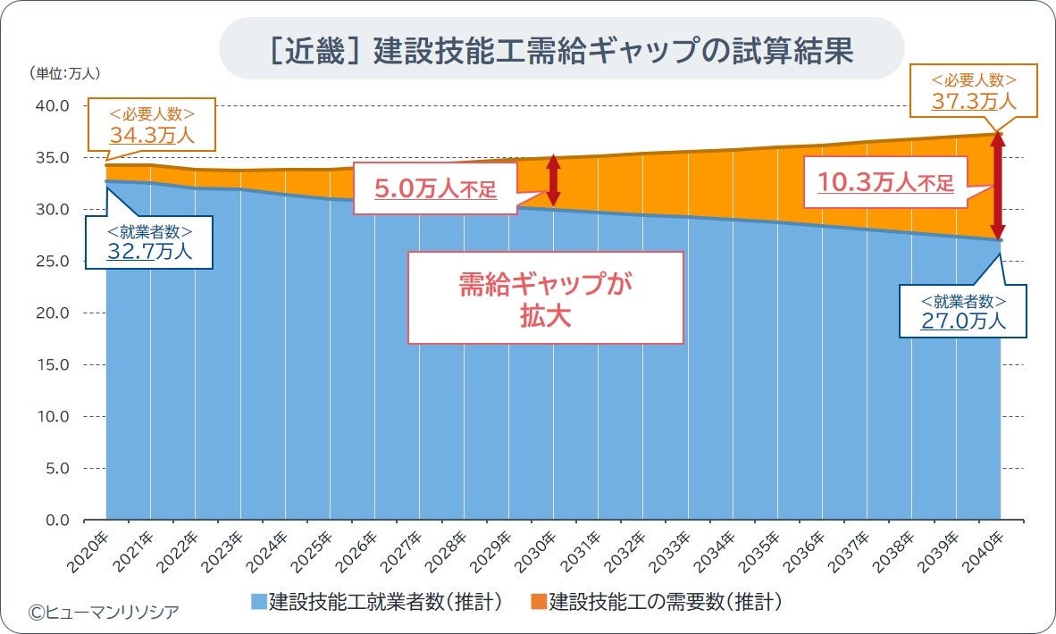 総合人材サービス会社で、建設業向けの人材派遣・海外エンジニア派遣・人材紹介事業を展開するヒューマンリソシア株式会社(本社:東京都新宿区、代表取締役:高橋 哲雄、以下「当社」)はこのたび、近畿エリア(※1)における建設技術者および建設技能工(※2)の2040年までの将来の人材需給ギャップを試算しました。なお本調査は、2024年に当社が発表した全国版の建設技術者・技能工の将来推計(※3)を元に、近畿エリアの人材需給ギャップについて試算したものです。