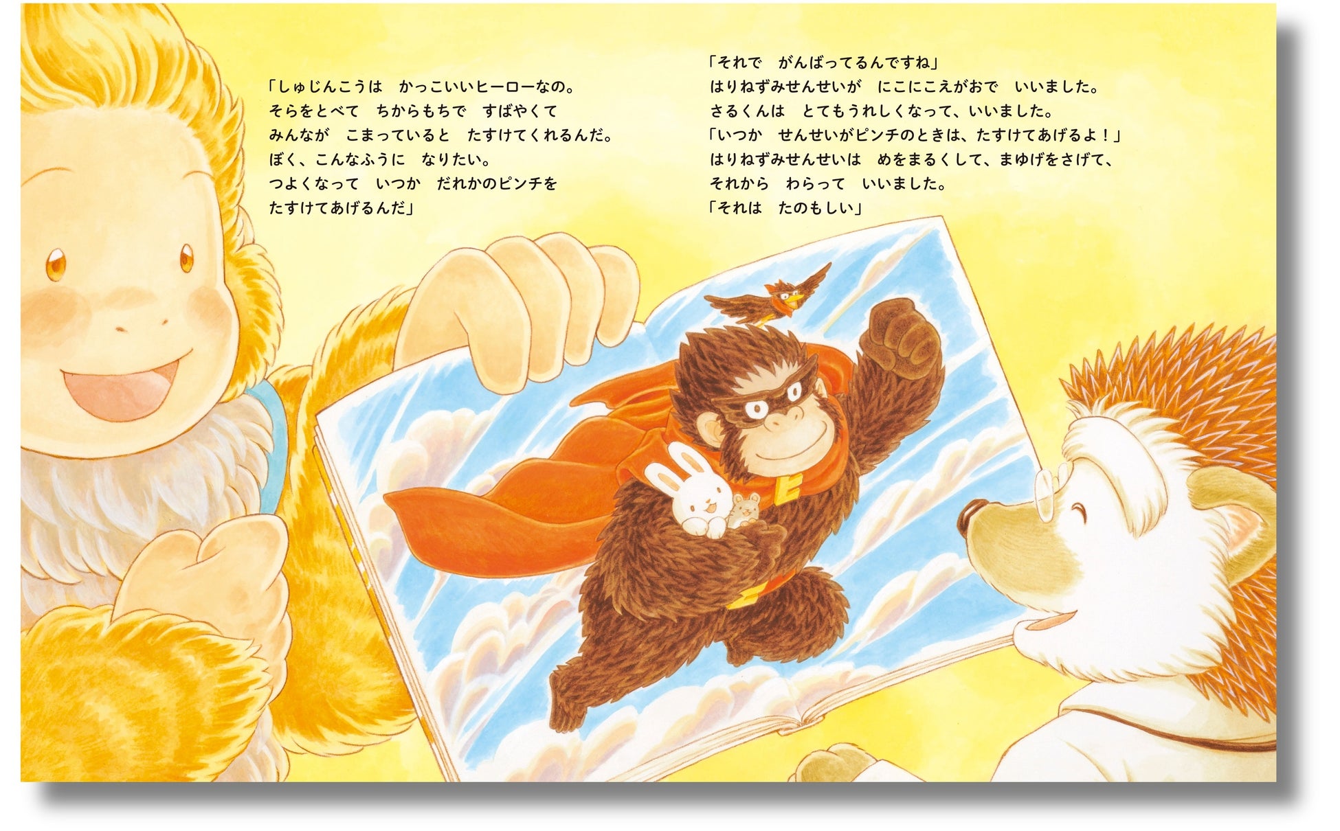 第三弾の主人公は、ヒーローになりたいけれど、失敗ばかりのさるくん。持ち前の発想力と、だれかをたすけたい!というまっすぐな思いがきらりと光るお話です。