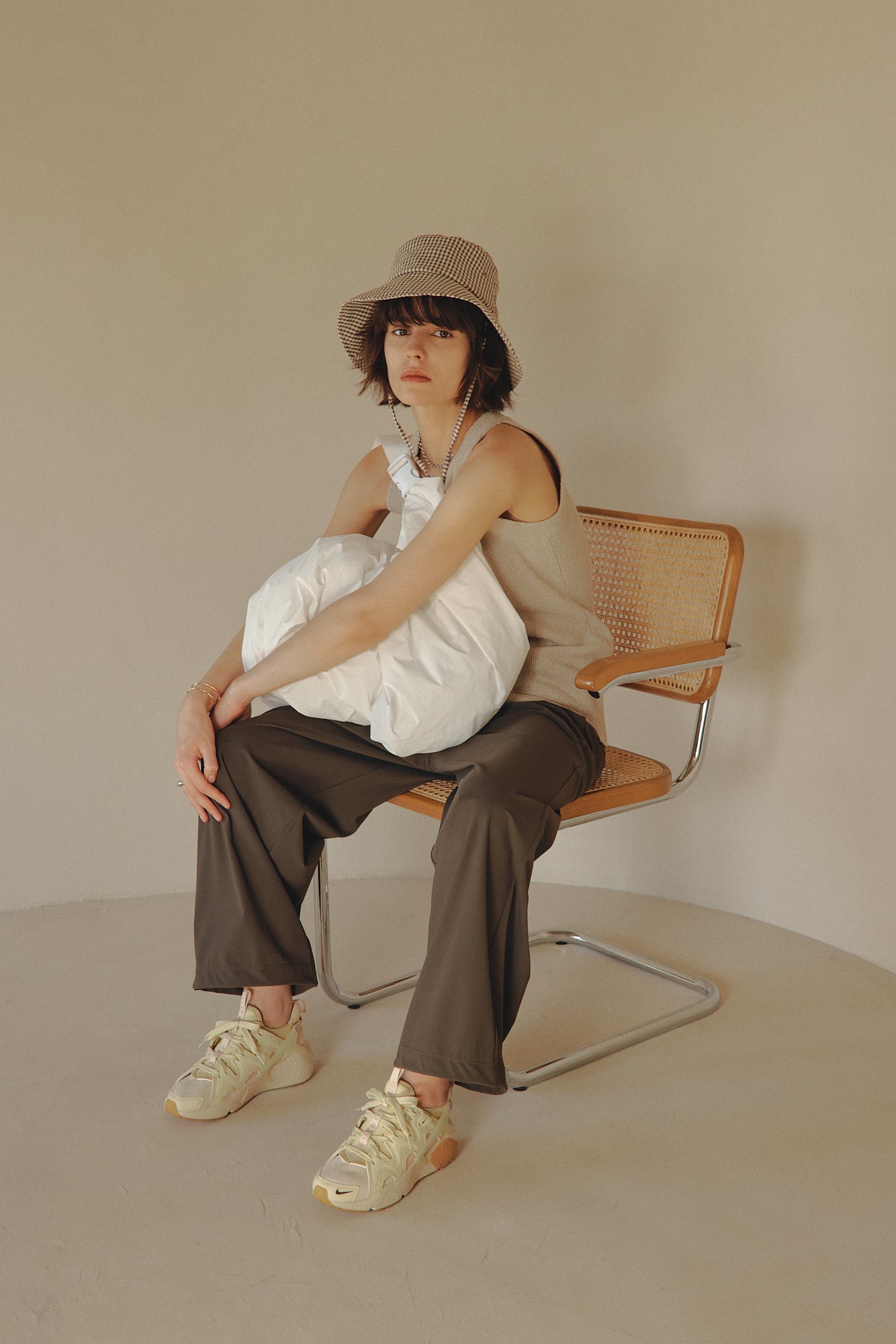 海で廃棄される漁網ネットや生地の端材、工業用ナイロンなど廃棄物を原料とする再生ナイロンを使用したサステナブルなコレクション。今シーズンは深みのあるブラウンをキーカラーに、大人のリラクシーさ漂うデザインに。 伸縮性に富み、シワになりにくいのも特徴で、アクティブシーンにも活躍します。