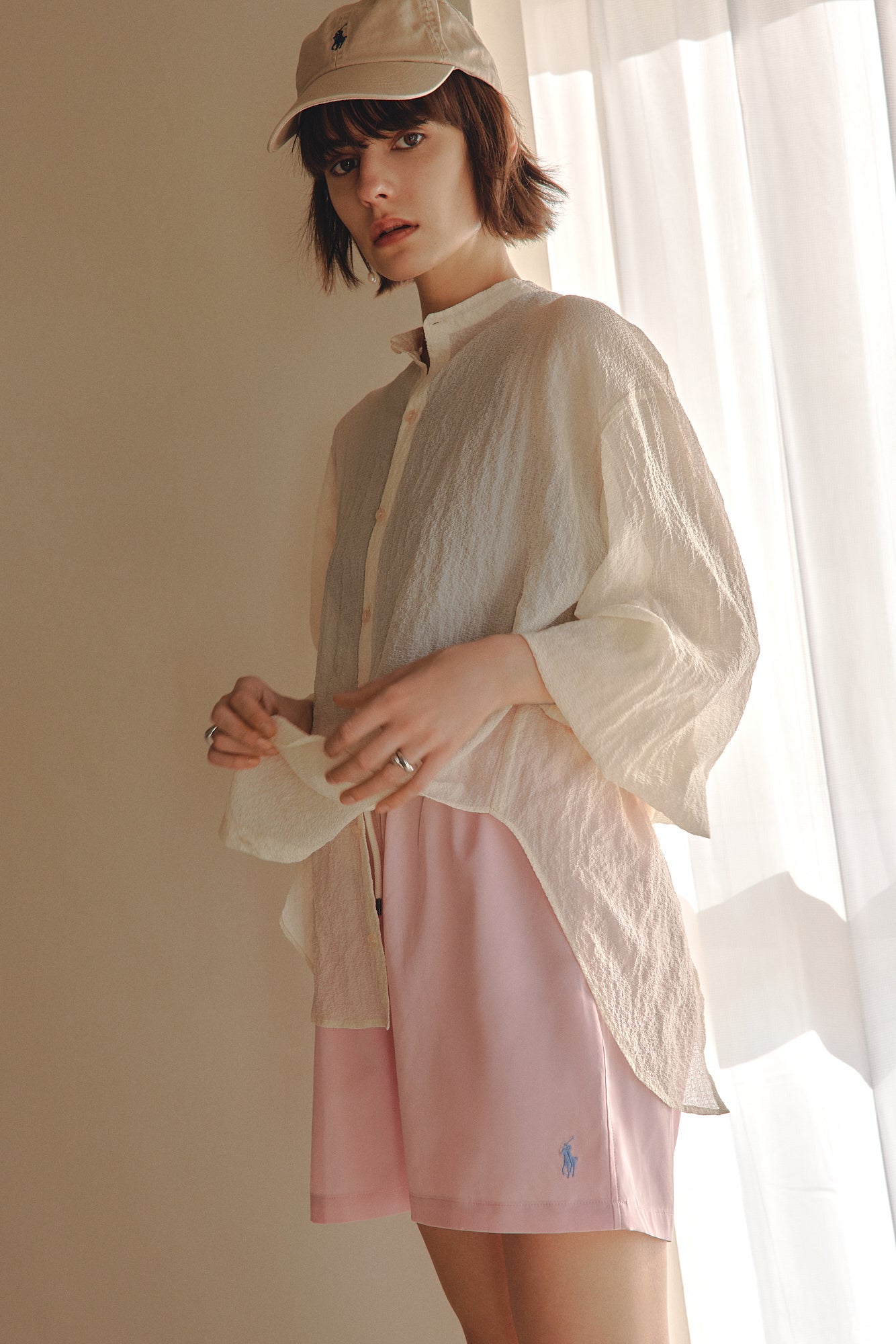 通気性の良いリラクシーなシルエットながら高級感のある印象に。