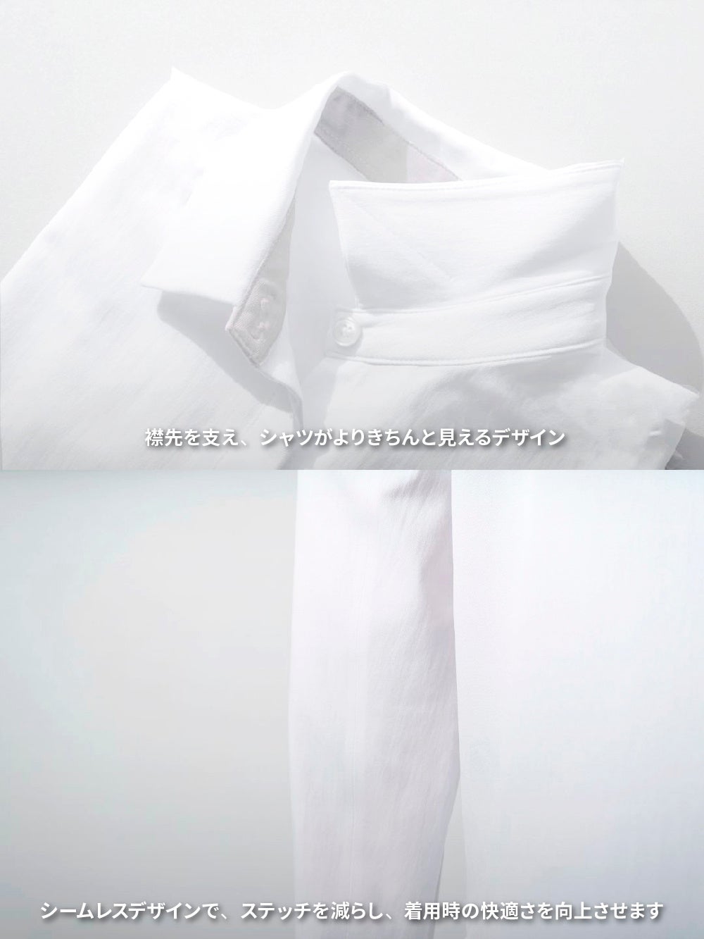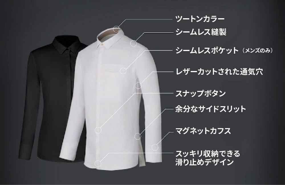 従来のシャツを着用する時の不快感や弱点を一新した、機能的なデザインになっています。