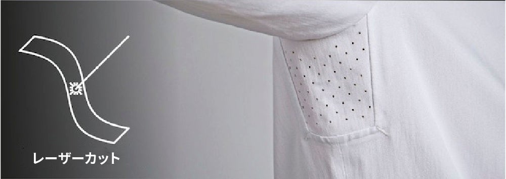 レーザーカット技術を使用して、脇の下に風を通すように布を切り抜き、「ベンチレーター」として自然換気を実現しています。
