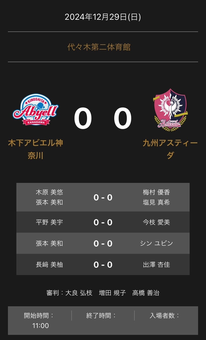 ノジマTリーグ 2024-2025シーズン 公式戦 12月29日開催 木下アビエル神奈川 vs 九州アスティーダ 対戦オーダー発表
