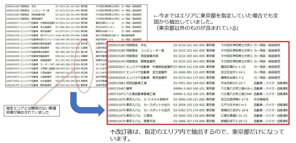 また、今まで指定した都道府県にある「支社・支店・工場・チェーン店」という条件を選択すると、その都道府県の「支社・支店・工場・チェーン店」に紐づく企業が全国エリアで表示されていたのが、「支社・支店・チェーン店」と「工場」共に指定したエリア内のみで抽出されるようになりました。