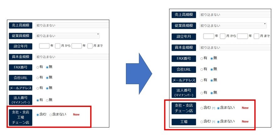 この度、「支社・支店・工場・チェーン店」という絞り込み条件だったのが、「支社・支店・チェーン店」と「工場」が別々に条件指定できるようになりました!
