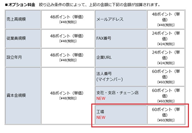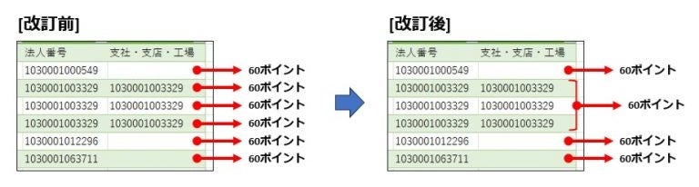 また、支社・支店・チェーン店はこれまで同一法人番号のものも単純にレコード数分60ポイントの課金がされていたところ、同一法人番号のレコードは1グループで60ポイントの課金に変更致しました!