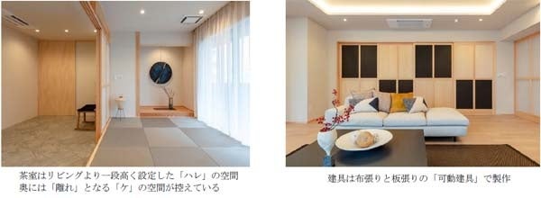 障子や襖など、空間を仕切る「可動建具」、状況や機会によって使い分ける空間の形式「ハレとケ」(人をもてなす「ハレ」と日常生活を営む「ケ」)、同じ家の中であるものの別の空間として取り扱う「離れ」という要素を抽出し、現代の住まい方へと再構成しています。