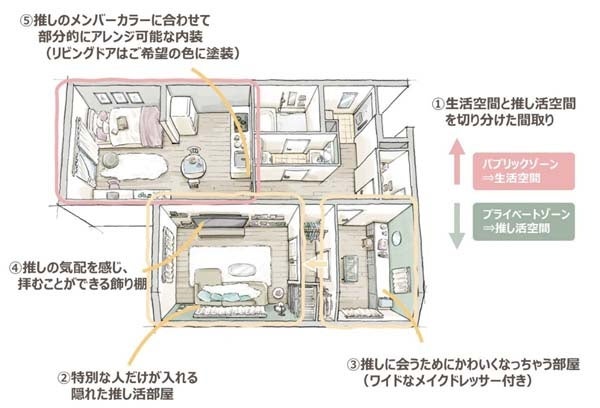 推し活を楽しむお客さま像をより具体的にイメージし、推しのイベントが多い池袋での街頭インタビュー等を通して、ニーズを整理し間取りや仕様に盛り込みました。
