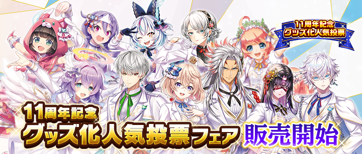 「11周年記念グッズ化人気投票」にて対象の順位を獲得したキャラクターたちの描きおろしイラストが完成! そのイラストを使用した新グッズや公式イラストを使用したグッズを本日より販売開始しております。