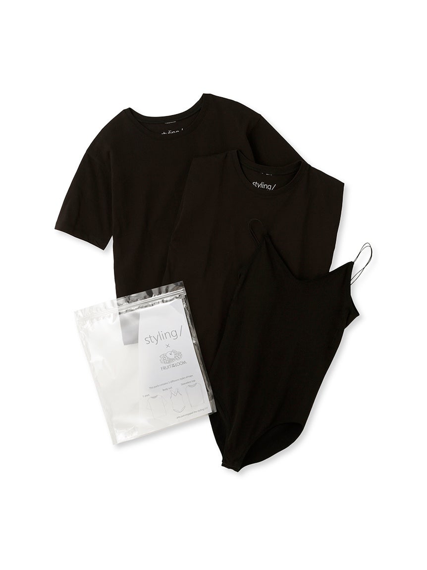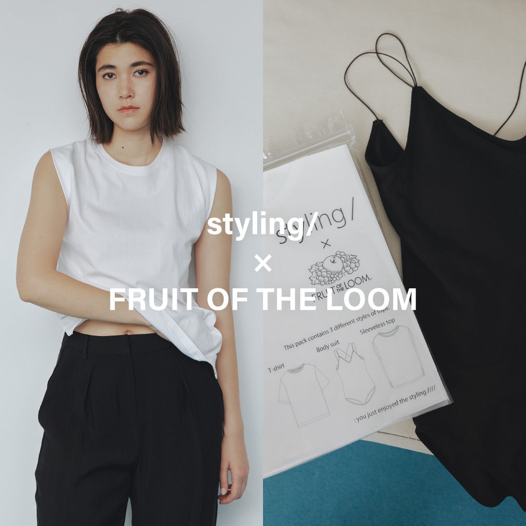 初となるコラボレーションは“FRUIT OF THE LOOM (フルーツオブザルーム)“と”styling/“それぞれのブランドで人気のTシャツ、タンクトップ、ボディスーツの3アイテムを1パックに凝縮。