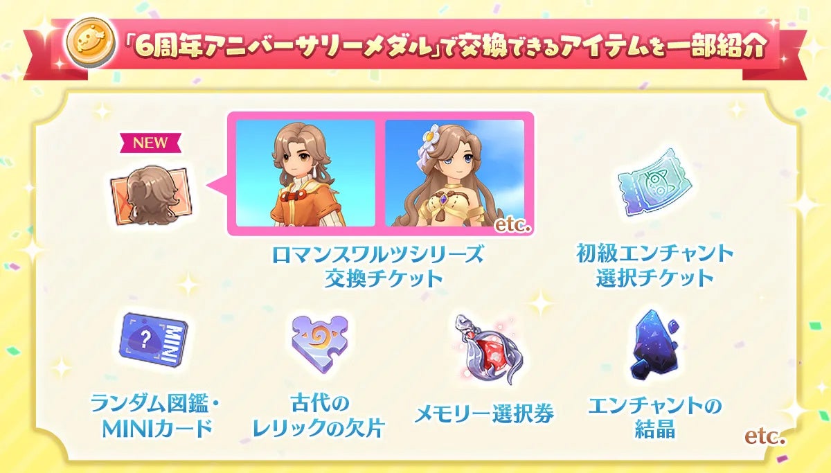 「6周年アニバーサリーメダル」はプレゼント用のアイテムの他、「ロマンスワルツシリーズ交換チケット」「初級エンチャント選択チケット」「古代のレリックの欠片」「ランダム図鑑・MINIカード」などの豪華アイテムとも交換が可能です。この機会に仲間たちと共にモンスター討伐へ出発しましょう。